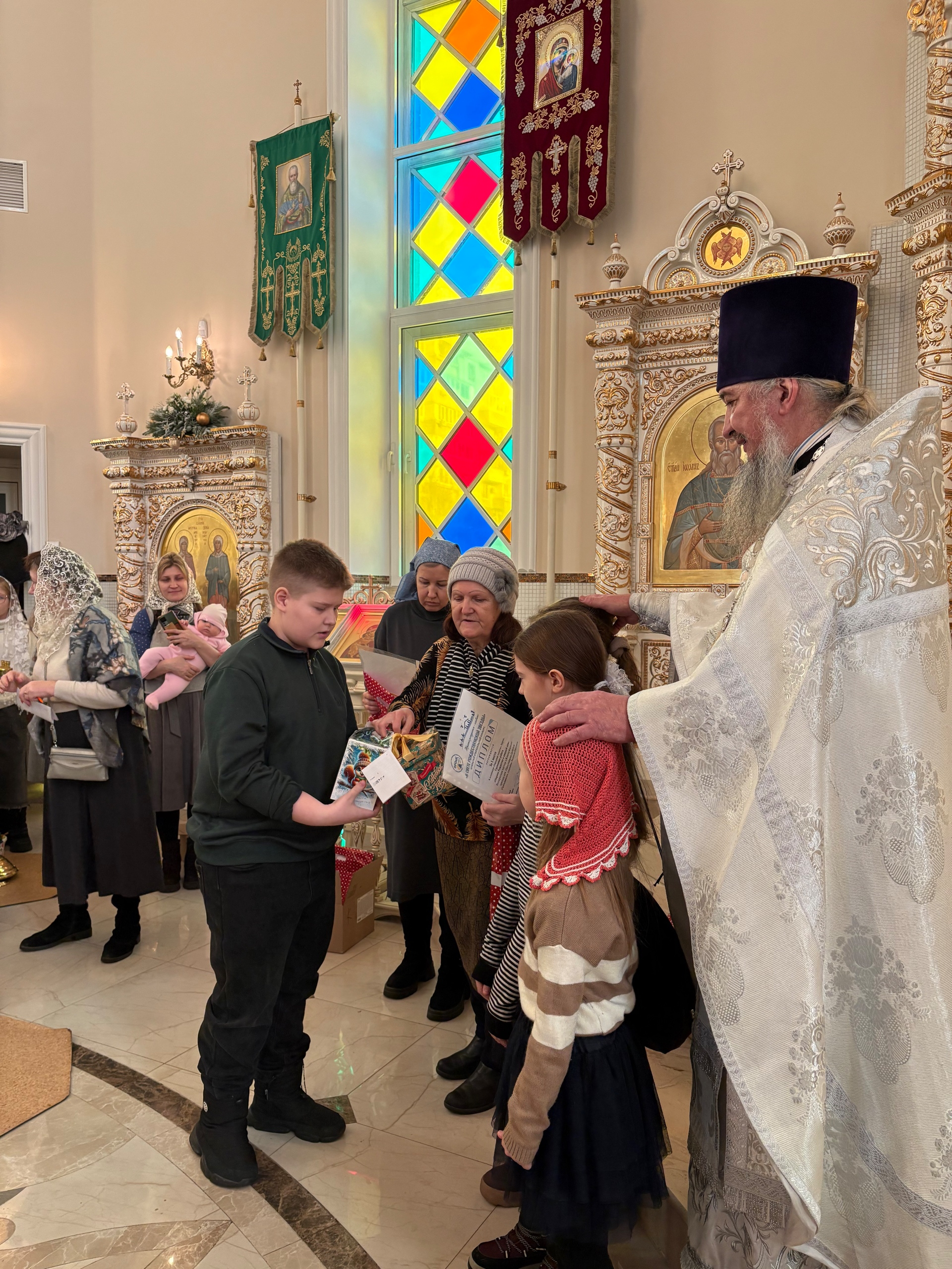 После Божественной литургии дети, родители и педагоги организованно подошли к амвону, где должна была начаться процедура награждения. победителей.